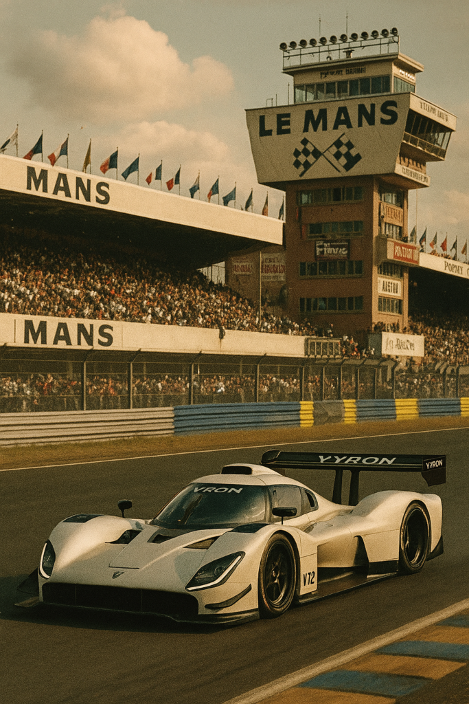 Sur le circuit le plus mythique du monde, là où résonnent encore les prototypes légendaires, Vyron a choisi de dévoiler sa création la plus radicale : la V12R Proto, un prototype atmosphérique conçu comme un manifeste. Un hommage vibrant à la performance pure, à la mécanique noble et à l’émotion brute.